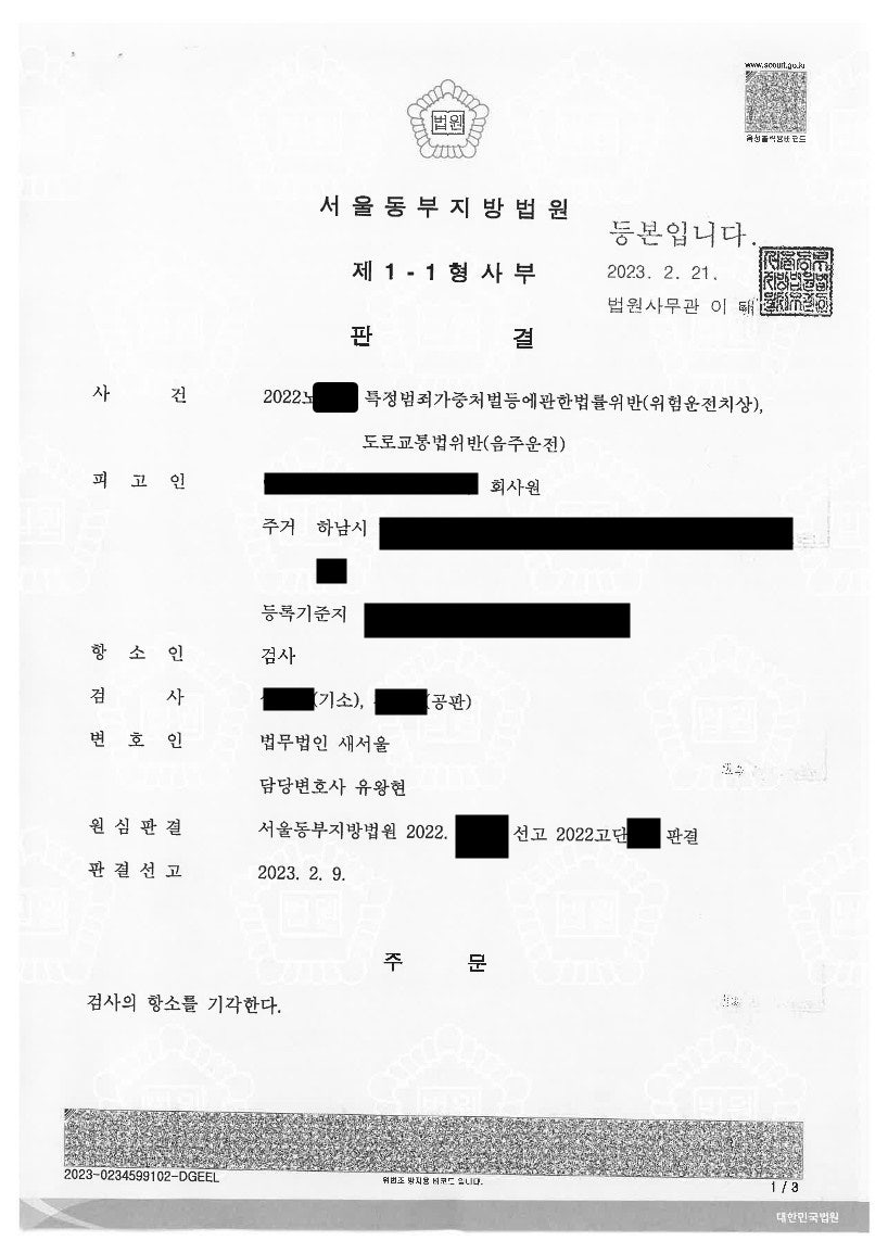 이 의뢰인은 검사가 항소했을 때 안일하게 생각하지 않고, 항소심에서 저에게 사건을 의뢰하여 마무리가 잘되었습니다.
