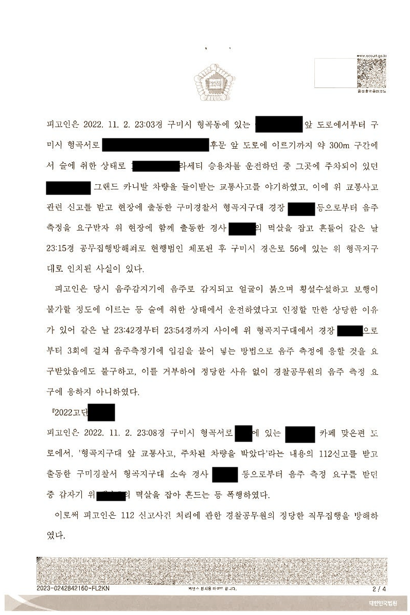 피고인은 2022. 11. 2. 구미에서 술을 마시고 운전하다가 주차되어 있는 차량을 들이받고, 본인의 차는 인도로 넘어가는 사건이 생겼습니다.