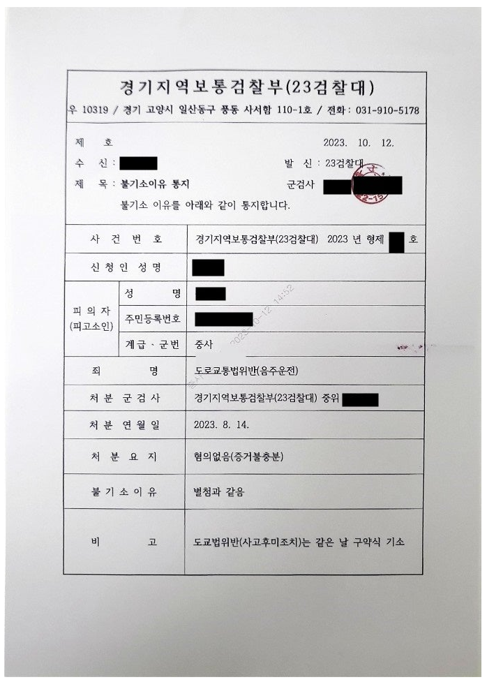 다행히 군검찰단에서는 음주운전의 혐의는 혐의없음처분을 하였고, 사고후 미조치는 구약식 벌금을 하였습니다. 이로써 의뢰인은 억울한 누명을 벗어 지옥에서 살아돌아오게 되었습니다.