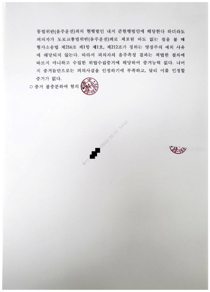 음주운전에 대하여 혐의없음 처분 결정 사례-